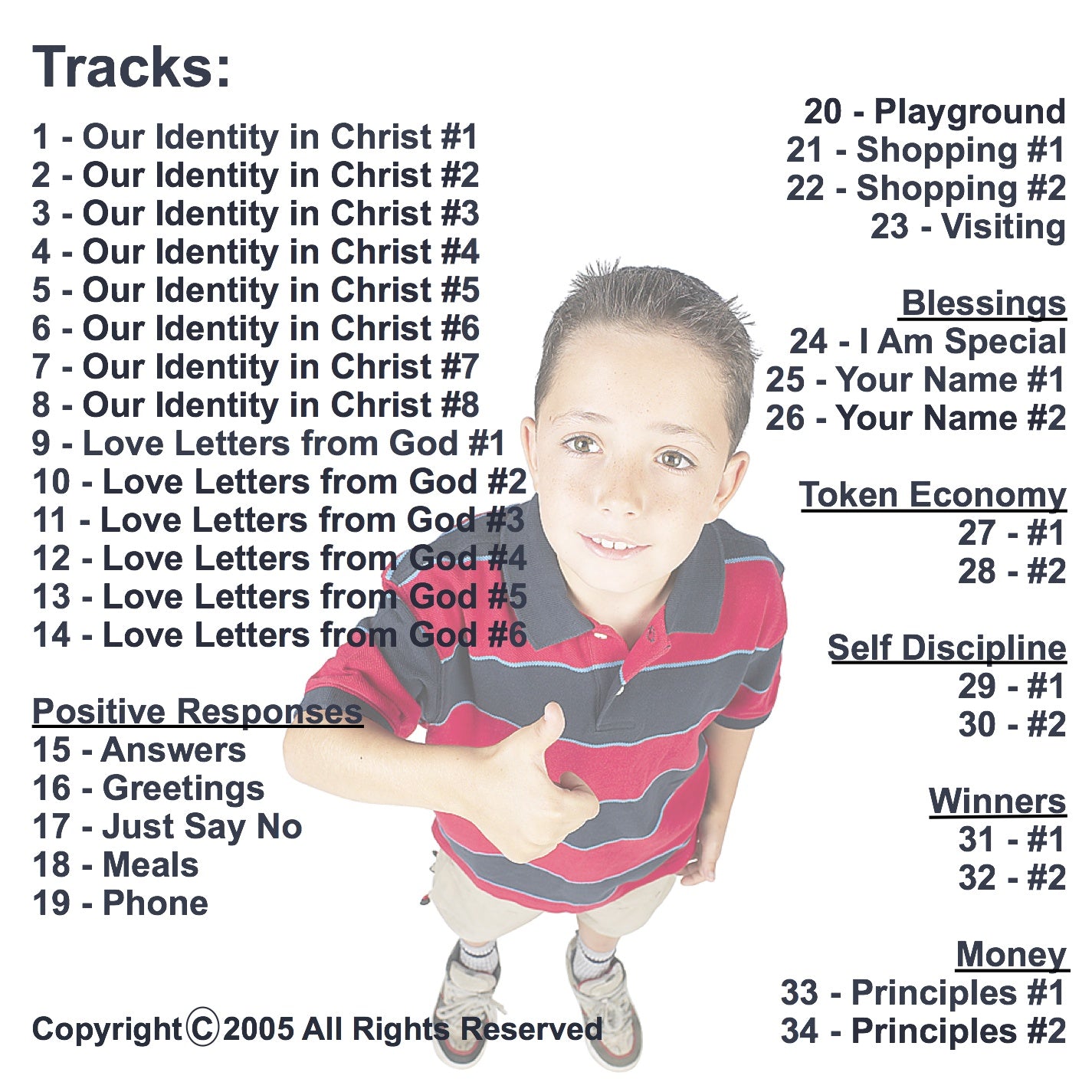 All children need to know how very special they are in the eyes of their parents, but also in the eyes of God. These audio tracks will positively impact your child's self-esteem and reaffirm what a wonderful miracle of God they truly are. These tracks helps improve self-esteem, self-control, and helps to establish your child's identity in Christ. Included on this download are the following: Positive Affirmations, Phone Etiquette, Positive Responses to Situations, Manners, Greetings, Blessings, Self Discipline, and Love Letters from God.
