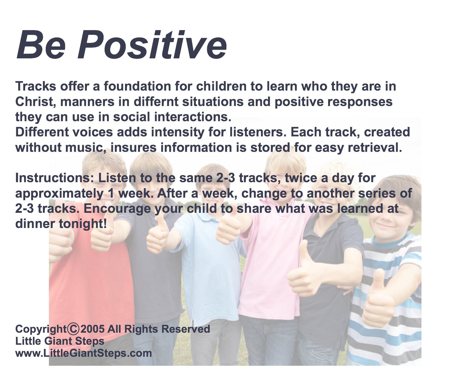 "My son LIKES the Be Positive CD; as a matter of fact, he now seems to readily apologize for mistakes/misconduct--something he has NEVER been known to do. While we were talking a couple of weeks ago, he told me that something was 'delightful'. That sure brightened my day! (Need I point out that he never, ever has been known to say positive things--much less pleasant?!) I have also noted an improvement with willingness to cooperate and in a general sense, there is a slightly noticeable improvement in relationships with people... (Not constant, and not huge--but YAHOO!!) I hesitated to buy this CD because I didn't want to waste my money, knowing how much my very-negative child would hate listening to it. I'm so glad I was wrong about this one!!!" - E. W., Kerrville, TX 12/07
