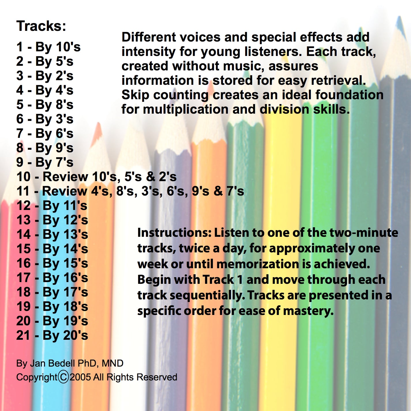 This is not your typical skip count recording. This product is based on the NeuroDevelopmental concepts of frequency, intensity and duration. Different voices and special effects add intensity for young listeners. Each track, created without music, assures information is stored for easy retrieval. Skip counting creates an ideal foundation for multiplication and division skills. This product